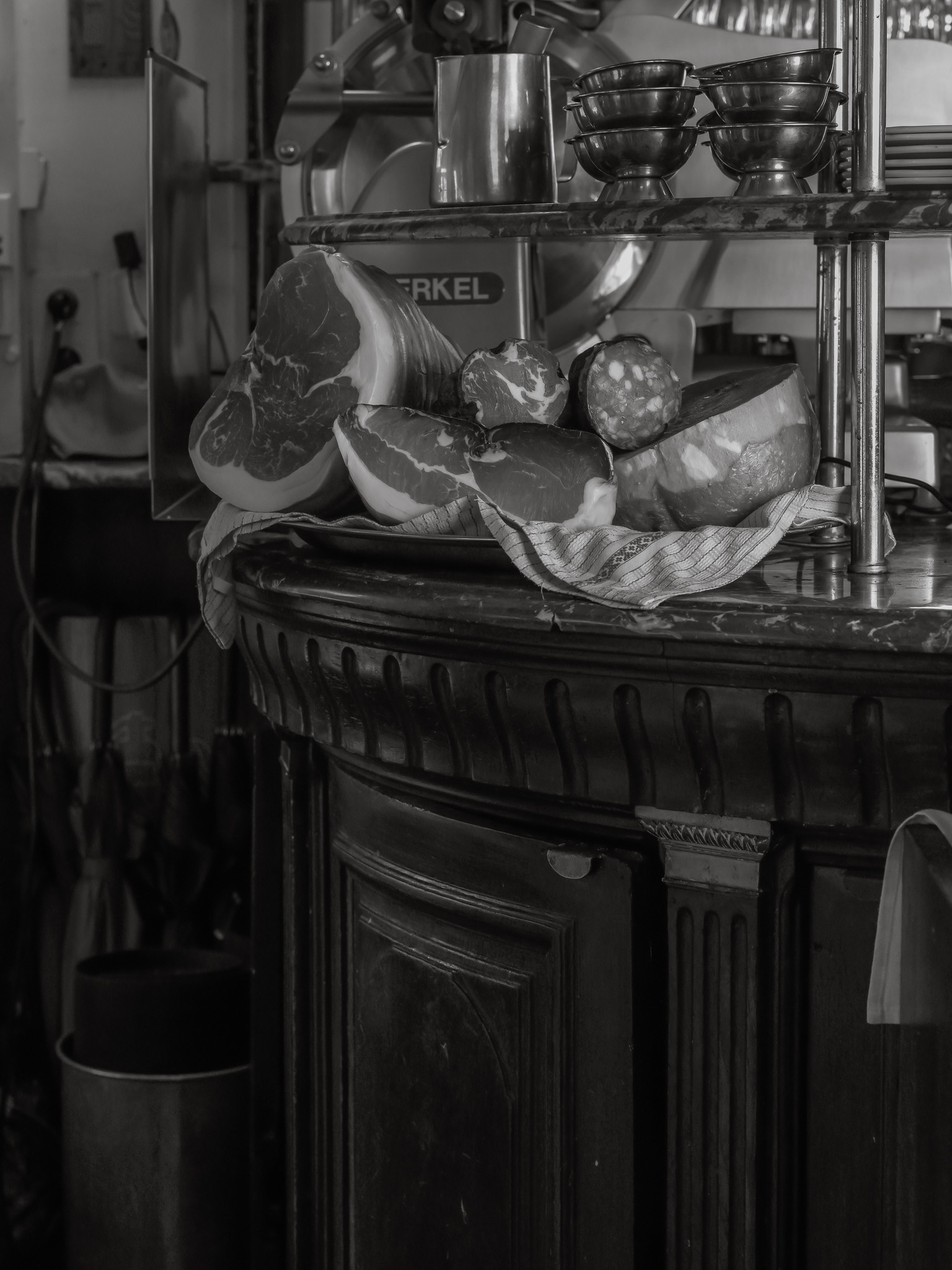 Trésors de produits transalpins : charcuterie (jambon de Parme, mortadelle à la Truffe….) mozzarella à bonne température, buratta et autre antipasti, parmesan longuement affiné, pâtes fraîches, viandes et poissons, Tirumisù, panna cotta etc. À partager sans modération.